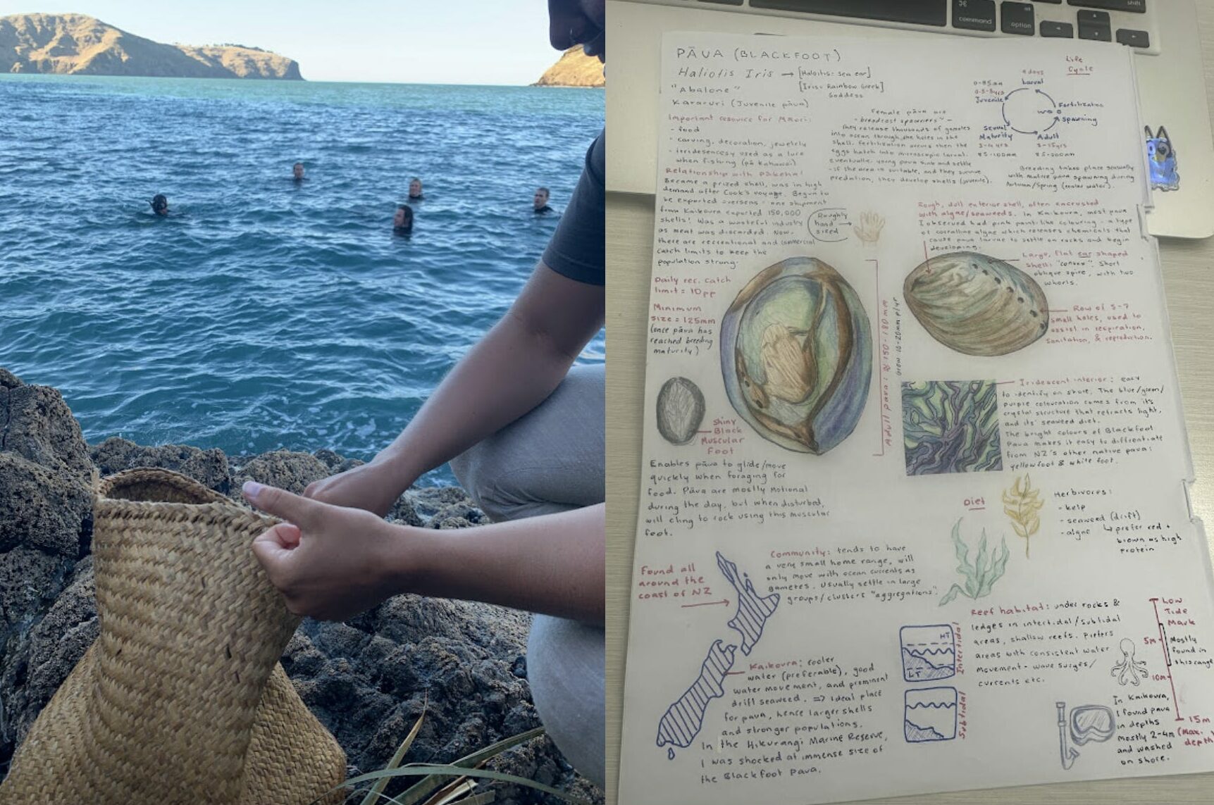 A kete woven with tradition and purpose, used to gather kai moana, paired with handwritten reflections on paua—capturing the rich blend of Mātauranga Māori and personal learning that defines the Ara journey.