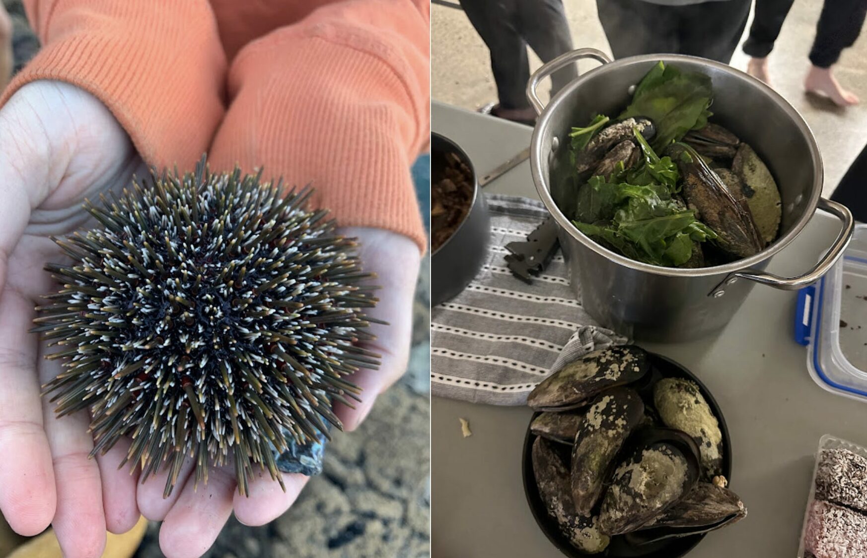 Harvesting kai moana—mussels cooking over the fire and kina held with care. A hands-on journey into sustainable food gathering and deeper connection to te taiao (the natural world).