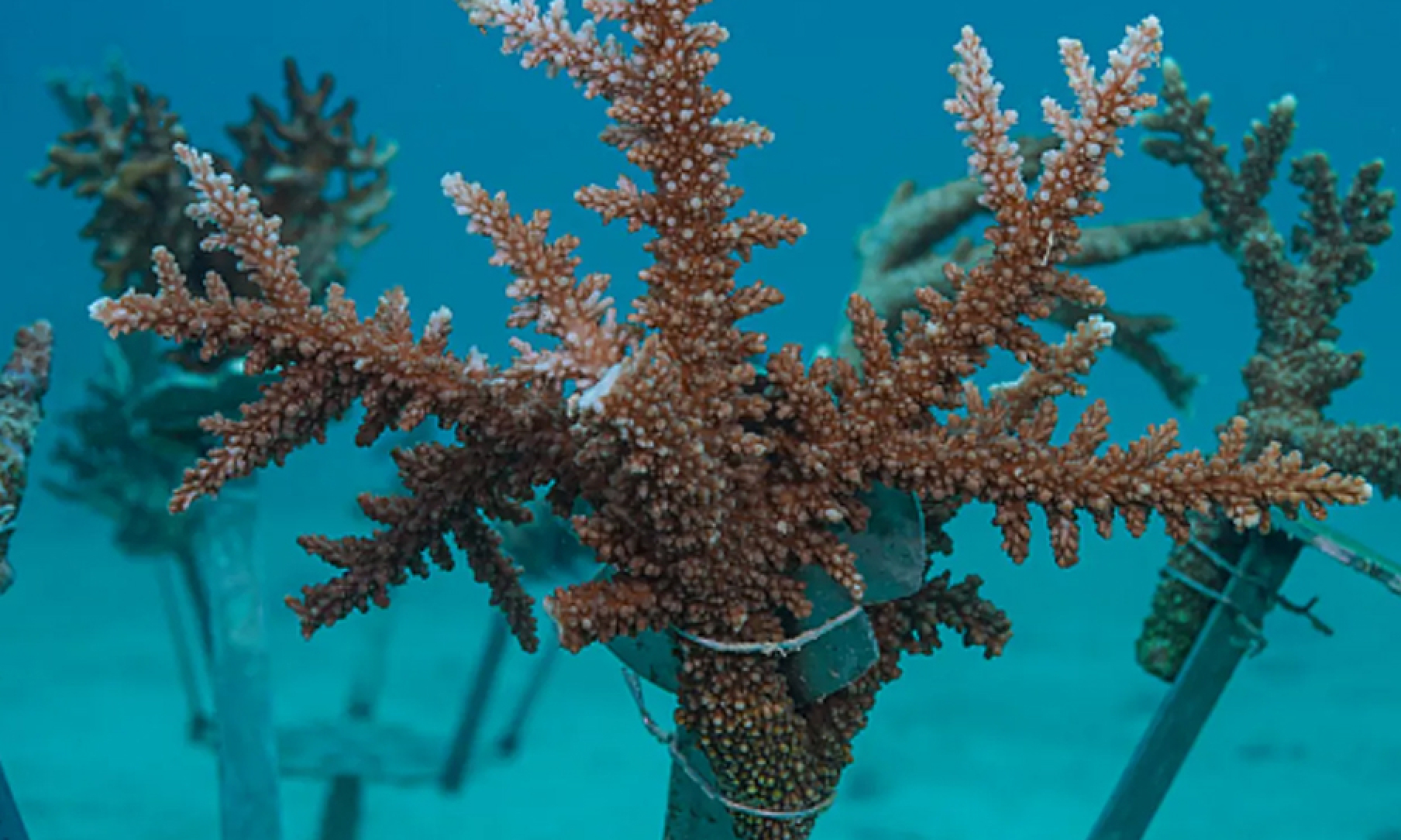 Coral fragment, now thriving on an underwater sculpture, is part of a living art installation restoring marine ecosystems, one polyp at a time